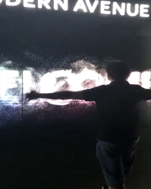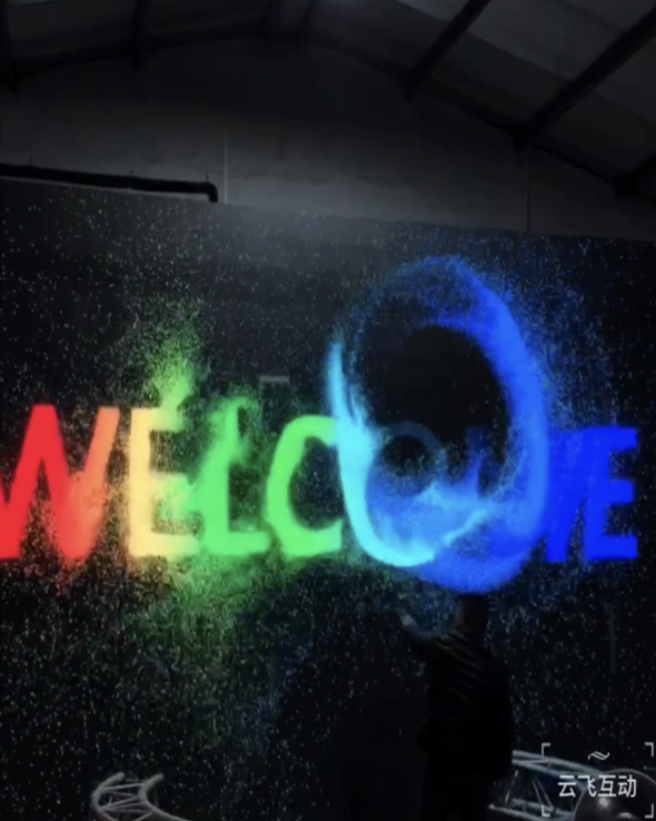★沒(méi)有人的時(shí)候就是一個(gè)靜態(tài)的LOGO,有人走過(guò)時(shí)組成LOGO的粒子被打散隨后又聚合一塊,形成非常炫酷的粒子效果,極大的增強(qiáng)了互動(dòng)性和品牌宣傳的效果。