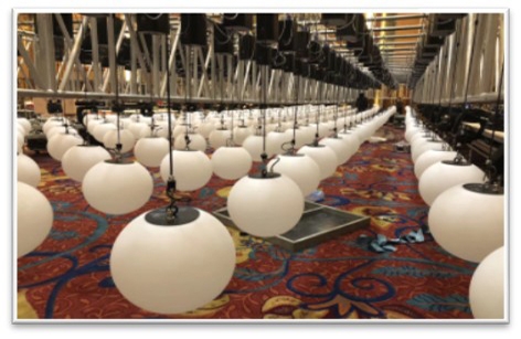 ★備注:1.單個(gè)球體功耗為50W。2.從吊機(jī)掛鉤到球體底端高度為1.3米。3.兩球之間中心距根據(jù)實(shí)際應(yīng)用場景隨意調(diào)整、最小為50cm。